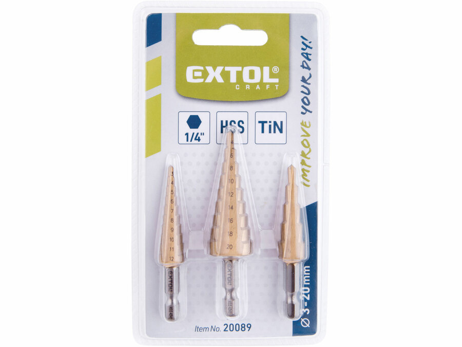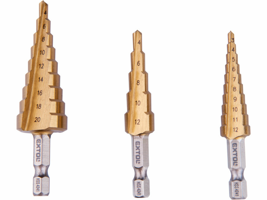 EXTOL CRAFT 20089 Vrtáky stupňovité, sada 3ks, ø3-12/1mm, ø4-12/2mm, ø4-20/2mm
