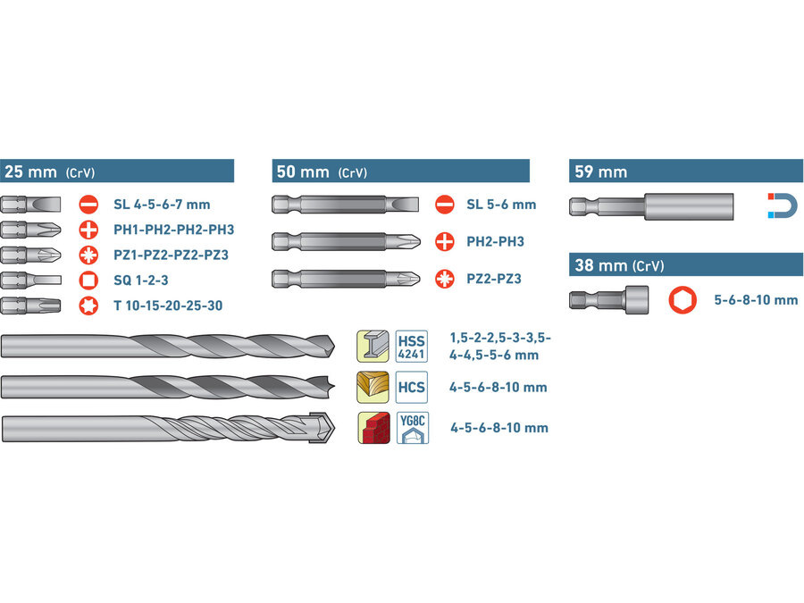 - materiál: vrtáky do dreva - HSC vrtáky do kovu - HSS-4241 hrot vrtákov do muriva - plátok SK-YG8C hroty a nástrčné hlavice - CrV