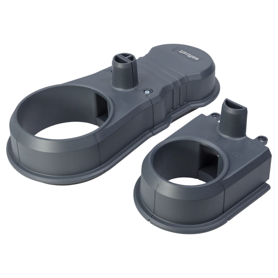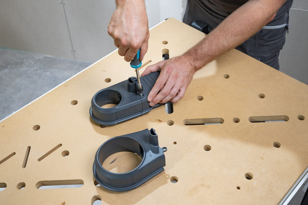 Pre rôzne možnosti použitia s vyrezávacími pílami a vŕtacími korunkami v rôznych veľkostiach sa dodáva odsávanie prachu s dvoma odsávacími jednotkami v priemeroch 68 mm a 100 mm, ktoré môžete podľa potreby vymeniť. Prípojka pre vysávač je kompatibilná so všetkými priemyselnými vysávačmi s hadicovými prípojkami s priemerom od 29 do 32 mm. Všetky diely sú vyrobené z kvalitného plastu zosilneného sklenenými vláknami (GFK). Stavíte tak na odolný kvalitný výrobok „Made in Europe“.