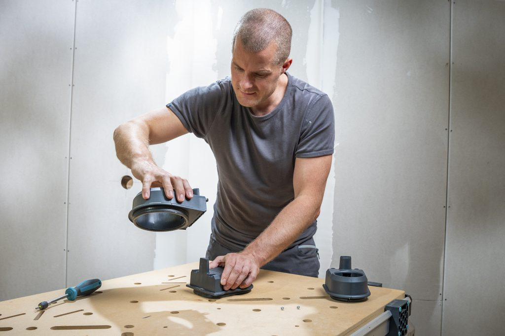 Trojdielne univerzálne použiteľné odsávanie prachu vám optimálne pomôže pri bezprašnom vŕtaní, napríklad s vyrezávacími pílami alebo vrtákmi. Patentovaný dizajn s dvoma oddelenými zónami vám umožňuje okamžité odsávanie prachu z vŕtania alebo jemných pilín priamo na mieste vzniku. Súčasne to zabraňuje vzniku prachových stôp, takže vaše steny zostanú spoľahlivo čisté a nepoškodené – ideálne, ak chcete vŕtať bezprašne na už natretých plochách.