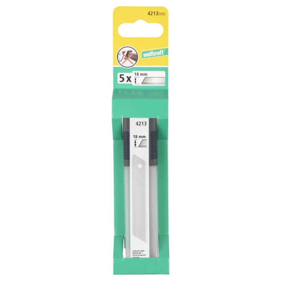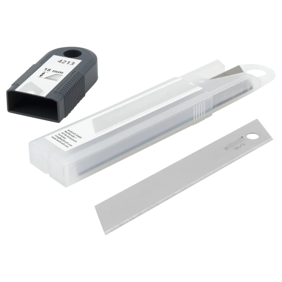 Bezpečnostné čepele bez odlamovacích segmentov s priemerom 18 mm poskytujú optimálnu bezpečnosť pri práci s nožom s odlamovacou čepeľou a s predĺženou čepeľou - ideálne napríklad na rezanie izolačných dosiek. Sú kompatibilné s komerčne dostupnými nožmi s odlamovacou čepeľou s 18 mm širokou rukoväťou. Možno ich bezpečne skladovať v priehľadnom plastovom boxe.