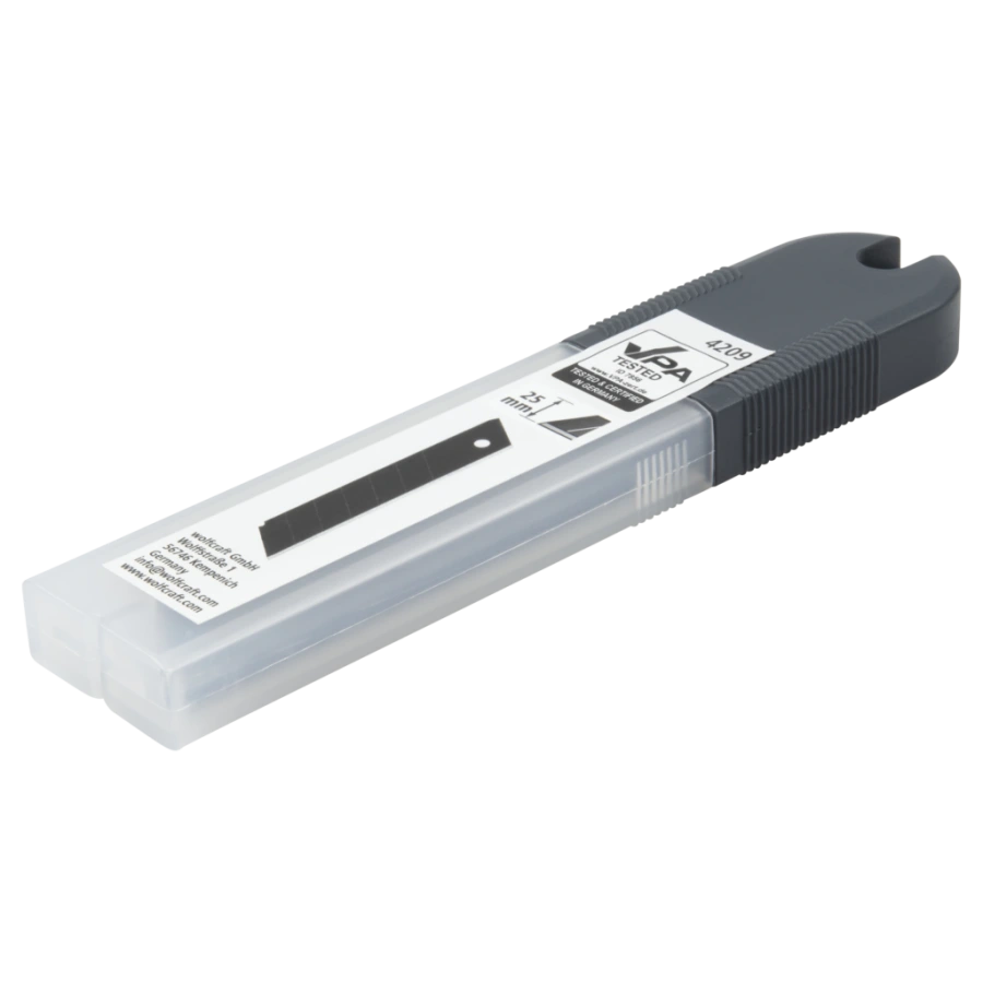 Päť čiernych extra ostrých, 25 mm širokých odlamovacích nožov z vysokokvalitnej uhlíkovej ocele ponúka vďaka špeciálnemu ostreniu s certifikátom VPA o 30 % lepší rezný výkon ako bežné nože. Sú kompatibilné so všetkými komerčne dostupnými nožmi s odlamovacou čepeľou s priemerom 25 mm. Čepele majú osem odlamovacích segmentov. Dajú sa bezpečne skladovať v priehľadnom plastovom boxe.