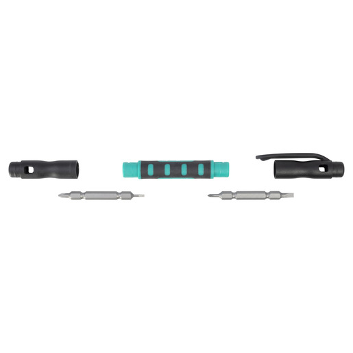 Praktické mikrobitové pero so štyrmi obojstrannými dvojitými čepeľami je ideálne pre opravárenské práce na okuliaroch, hračkách, kalkulačkách, domácich spotrebičoch alebo iných predmetoch s filigránovými skrutkovými spojmi. Osahuje štyri bity na mikro skrutky s hlavou Phillips® alebo drážkovou hlavou (PH0 + SL 1,5/PH00 + SL 3,0).