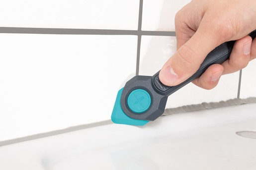 Pravouhlá geometria škrabky zaisťuje bezpečné vedenie v škáre. Zatiaľ čo dve skosené hrany zoškrabujú silikón alebo akryl z obkladačiek a keramiky, stredový tŕň účinne čistí aj jadro škáry. Vďaka ergonomicky tvarovanej rukoväti sa s ňou pracuje ľahko a pohodlne. Po vyplnení škáry novým silikónom alebo akrylátom prichádza na rad stierka na škáry.
