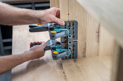 Spoje medzi drevenými prvkami sa vytvárajú pomocou skrutkovacích hmoždiniek, výstredníkových kotúčov a drevených kolíkov. Pomocou dvojdielnej vŕtacej šablóny sa stanovia správne miesta pre otvory, ktoré sa potom vhodne vykonajú pomocou vrtákov s hĺbkovou zarážkou do spájaných prvkov nábytku. Vŕtacia šablóna ponúka aj raster otvorov so štandardnou vzdialenosťou 32 mm, s ktorým sa dajú vytvárať rady kolíkov napr. pre police.