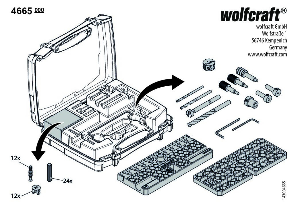 Praktický kufrík obsahuje dvojdielnu vŕtaciu šablónu z kvalitného plastu a všetky potrebné vrtáky s hĺbkovou zarážkou pre vŕtanie s obmedzenou hĺbkou. Súčasťou súpravy sú aj spoje nábytku a kolíky v dostatočnom množstve.
