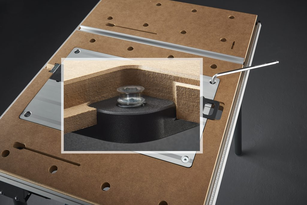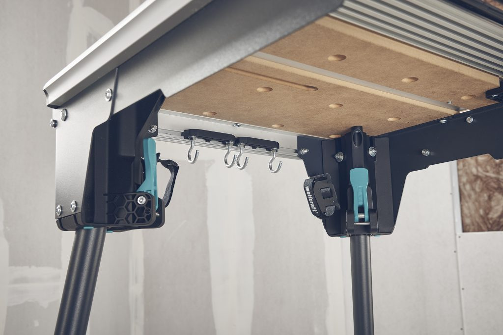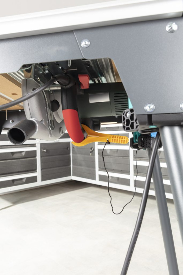 V doske stola sa nachádza zásuvka pre dodávaný šesťhranný nástrčný kľúč. MASTER cut 2200 je vybavený háčikmi na zavesenie dodávaného príslušenstva, ako je prítlačná lišta alebo uholník, aby boli v prípade potreby ľahko po ruke. Sú pripevnené na vnútornej strane profilu, aby sa stôl dal voľne uložiť.
