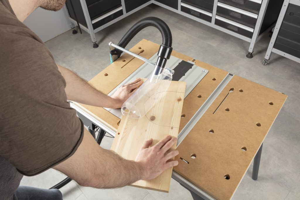 Bezpečnostný spínač je umiestnený na boku stola, takže náradie môžete rýchlo a bezpečne zapnúť a vypnúť. Pri použití stola ako stolovej okružnej píly umožňuje paralelný doraz - ktorý možno upnúť na oboch stranách - vedenie rezov až do šírky 370 mm. Uhlový doraz je vybavený pružinovými vyrovnávacími a posuvnými prvkami. Môžete ho jednoducho použiť na uhlové rezy do +/- 60° vrátane celého radu opakovaných rezov. Nastaviteľný bezpečnostný štít s pripojením na vysávač pomáha zabezpečiť bezpečnú a bezprašnú prácu.