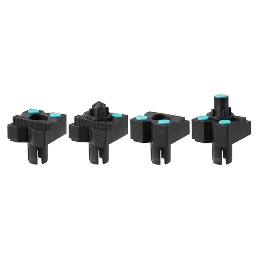 Štyri veľké plastové upínacie čeľuste s protišmykovými podložkami - s obojstranným lakovacím hrotom pre časovo úsporné lakovanie obrobkov + oporný čap s protišmykovou podložkou na zdvihnutie obrobku.