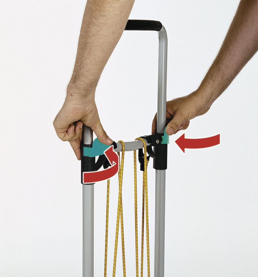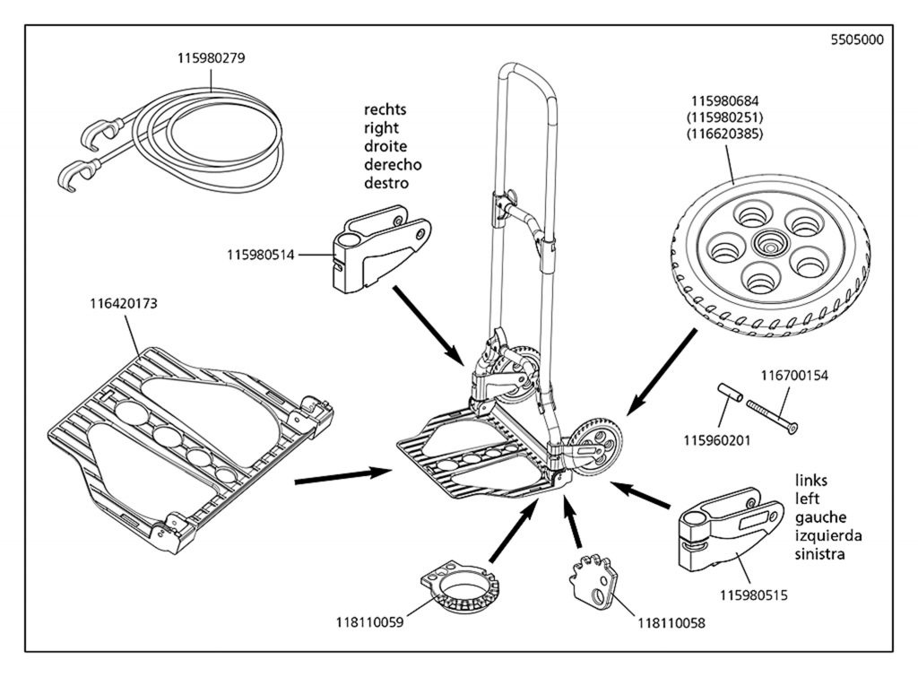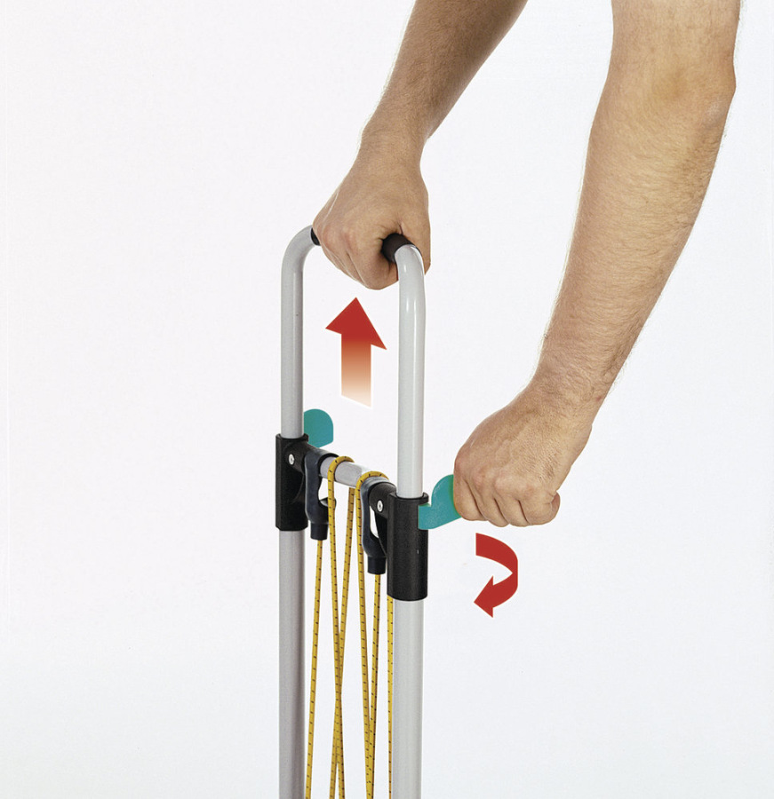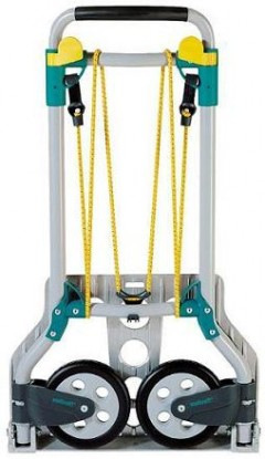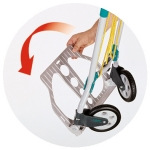praktický skládací vozík, kompaktní rozměry, snadno transportovatelný, velká kola, kuličková ložiska, individuální nastavení výšky do 104 cm, stabilní rozpora pro naklopení, 3 bodové upnutí nákladu, zakulacené držadlo, oblé zadní čelo pro přepravu oblých předmětů